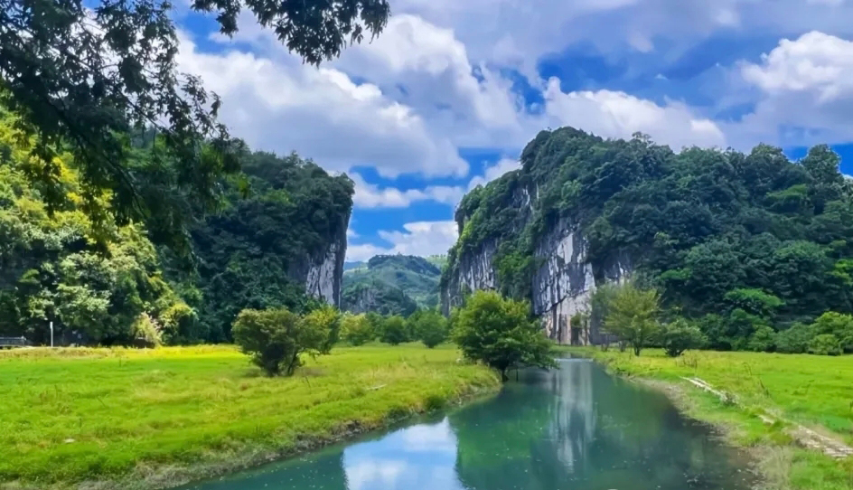湄江的地質奇觀令人嘆為觀止。蜿蜒的湄水如玉帶般穿梭于崇山峻嶺之間,兩岸百丈高崖直插云霄,形成綿延十里的峭壁畫廊。這里的巖溶地貌發(fā)育之完整堪稱教科書級別:從幼年期的溶溝石芽,到中年期的峰林峽谷,再到晚年期的孤峰殘丘,完整呈現(xiàn)了巖溶地貌的生命周期。